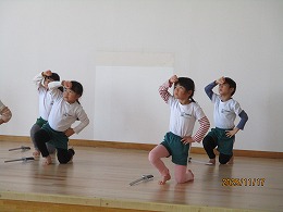 今日の給食は、ごはん・ピーマン肉詰めフライ・ブロッコリーサラダ・味噌汁(きざみ揚げ・なめこ)・オレンジ・牛乳です。 おやつは、手作りゼリー・煎餅です。 さくら組のお友達の表現遊びの様子です♪ 5歳のお友達は、白虎隊・劇(ピーターパン)・合奏(楽器)・ダンスの中から自分で行いたい演目を選び、発表会に向けて一生懸命練習に取り組んでいます(