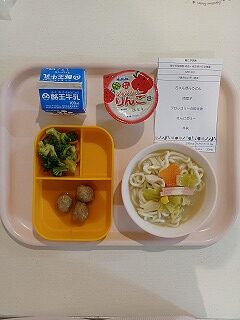 今日の給食は、新メニューのちゃんぽんうどんです。おかずは、肉団子、ブロッコリーの和え物で、野菜も肉もたっぷりのメニュー、デザートはりんごゼリーに牛乳です。 あかちゃん組のお友達も、おいしそうですね(*’▽’) おやつは、わかめおにぎりです。おなかいっぱい、うれしいね(*^-^*)