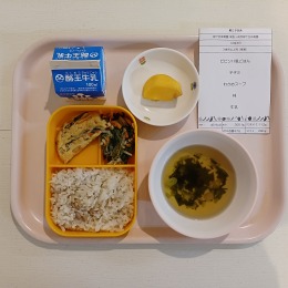 今日の給食は、ビビンバ風ごはん、チヂミ、わかめスープ、柿、牛乳です。 今日は秋の味覚で、柿のデザートでした。「おいしいー」と言って食べている子と、ちょっぴり苦手な子もいました。今月また、柿がデザートで出る日がありますので、食べれるといいなーと思います。柿には、「ビタミンC、リコピンβカロテンが豊富に含まれています。また、腸内環境を良くする効果もある