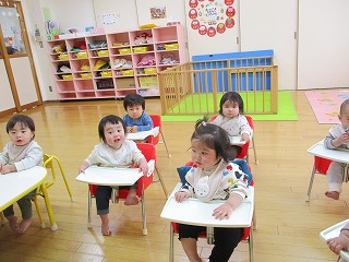 つぼみ組のあかちゃんも、先生と一緒に作品を作ります。毎月、かわいくてクスッと笑みがこぼれるチャーミングな作品で、癒されています(*^-^*) お正月あそびが、テーマの作品に添えられた写真・・・思わず声を出して笑ってしまいます。楽しい作品をご紹介しますね。 かわいいですよね。つぼみ組のお友達のお椅子に座って先生のお話を聞いています。成長に合わせて椅子