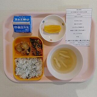 今日の給食は、わかめごはん、鶏のからあげ、いんげんの胡麻和え、みそ汁、オレンジ、牛乳です。卒園式の練習をがんばったさくら組さんに、今日の給食メニューを伝えると、『やったー!』と大歓声だったようです。今日も、ピッカピカの完食だったかな。 おやつは、おいしいメニューの大学イモです。さつまいもの甘みを楽しめる大学芋です。食物繊維が豊富で、おなかの調子を整