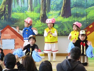 先週、ちゅうりっぷ組のオペレッタ『さんびきのこぶた』の発表会でした。練習の時は、ステージの上でもみんな楽しく踊っていました。発表会当日は、大好きなママ、パパ、おじいちゃん、おばあちゃんたちが大勢見にきてくれました。みんな緊張しないでできるかな・・・はじまり~ ステージの幕が開くと、観客の皆様の熱い視線を感じていたようで、ちょっとビックリの表情。『そ
