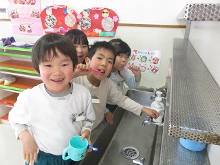 給食後には、歯磨きをしています。2歳のちゅうりっぷ組さんは、3学期からはじまりました。かわいくて小さな白い歯をゴシゴシと磨いていますよ。卒園を迎えたさくら組のお友達は、『歯がぬけたよ』、『(永久歯)はが生えたよ』と教えてくれましたよ。 虫歯がないきれいな歯をめざしましょうね。でも痛くなったら、すぐに歯医者さんに行きましょうね。 今日の給食は、ごはん
