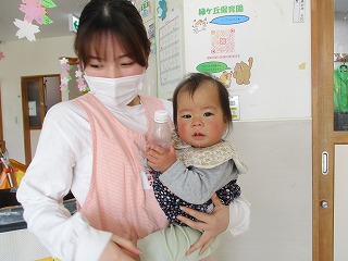 先生と遊んだり、抱っこされたり、水分補給して、少しずつ園生活に慣れていけるよう、ご家族の方と相談してすすめていますよ。