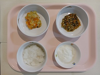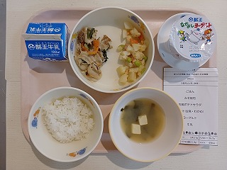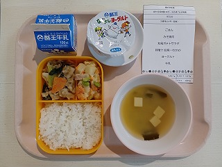 今日の給食は、みそ焼肉、和風ポテトサラダです。体を動かして遊んでおなかペコペコかな。