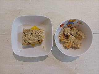 おやつは、給食室手作りのバナナケーキです。バナナをつぶしたものを生地に練りこみ、バナナのスライスを生地の上に置いて焼き上げました。愛情たっぷりのケーキ、召し上がれ(*’▽’)