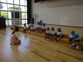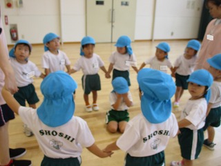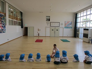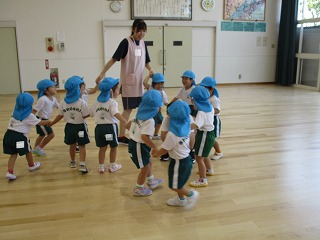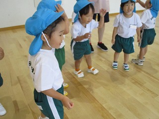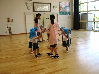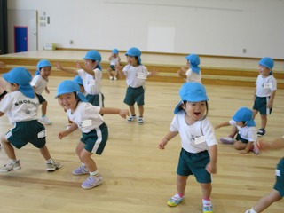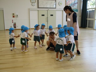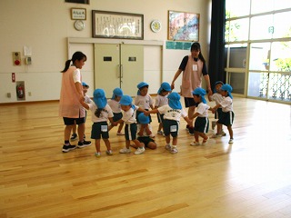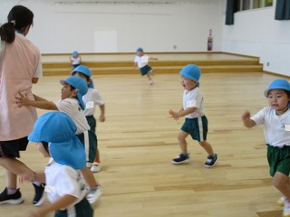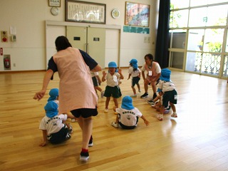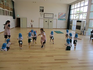 8月下旬からスタートしたホールの床板の修繕工事が終了し、ピカピカ☆になったホールでちゅうりっぷ組のお友達が、集団ゲーム遊びをしていました。