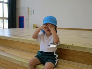 追いかけるクマさん、クマさんから逃げる子、 ひろーいホールに青色帽子のお友達が広がります。(ステージ前にチョコンと座っているお友達は、追いかけられるのが苦手で見学です)