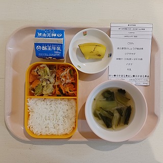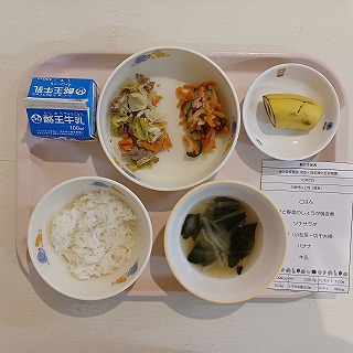 今日の給食は、豚と野菜のしょうが焼き煮、ツナサラダ、みそ汁(小松菜、大根)、バナナです