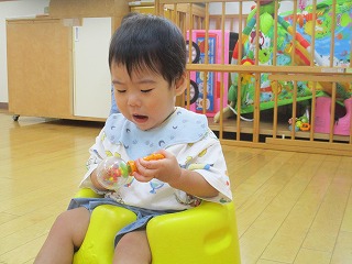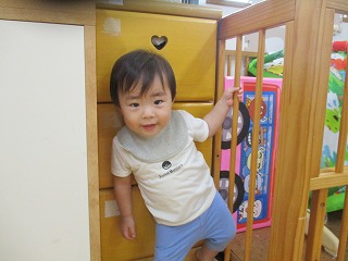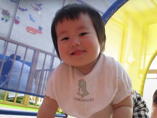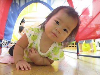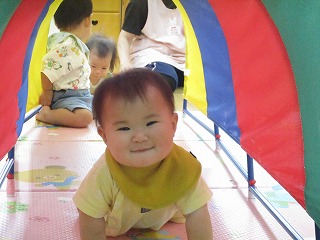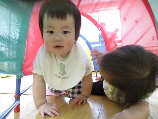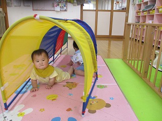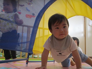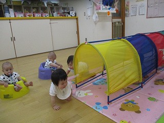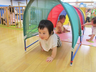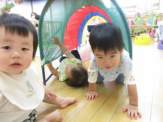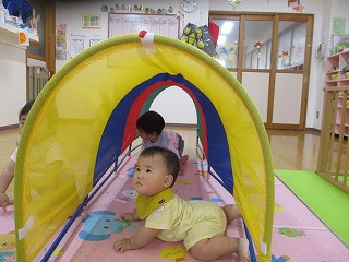 つぼみ組のあかちゃん達が、お部屋でトンネル遊びをしました。よちよち歩き、ハイハイができるお友達に、喜んでもらえるかな・・と、先生たちが組み立て始まると、「なに?なに?」と近づいてきました。トンネル完成! みんなが、集まってきましたよ。