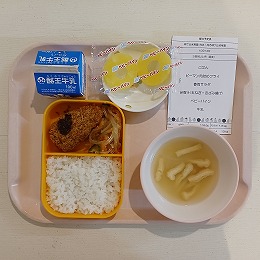 今日の給食は、ごはん・ピーマン肉詰めフライ(ピーマンとお肉をサクサクのフライに)・春雨サラダ・味噌汁(玉ねぎ、きざみ揚げ)・ベビーパイン・牛乳です。