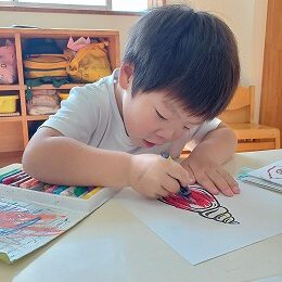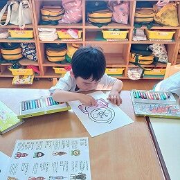 あやめ組のお友達は、運動会で被るこびとのお面を、自分の好きなこびとを選んで塗っていました🖍