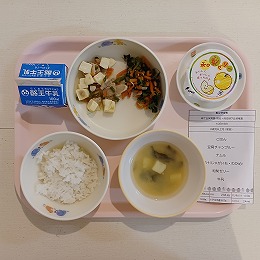 今日の給食は、ごはん・豆腐チャンプルー(優しい豆腐の味と野菜がたっぷり)・ナムル・味噌汁(じゃがいも、わかめ)・和梨ゼリー・牛乳です。