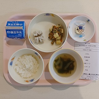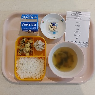 今日の給食は、マーボー豆腐、シュウマイ、中華スープ、ミニチーズです。
