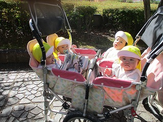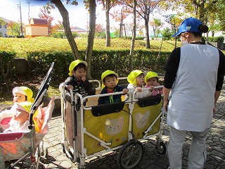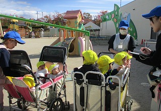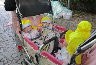 赤ちゃん組さんが、遊歩道にお散歩にお出かけです。帽子、靴下、アウターを着用して、準備はばっちりです。園を出る前には、お友達の名前を確認も忘れずに・・・