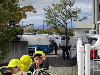 遊歩道にはドングリや赤い実、キノコなどを先生に見せてもらいました。帰り道には、「はたらく車」のゴミ収集車にもあえて、大喜びでした!!