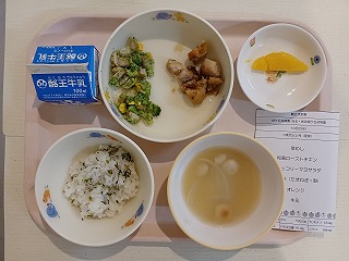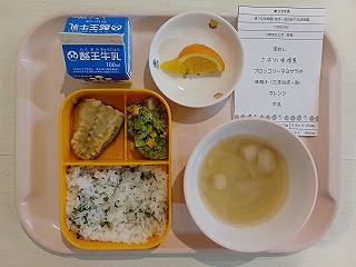 今日の給食は、菜飯、ブロッコリーサラダ、3~5歳 サバの味噌煮、0~2歳 和風ローストチキン、みそ汁、オレンジです。