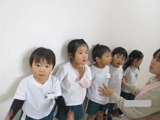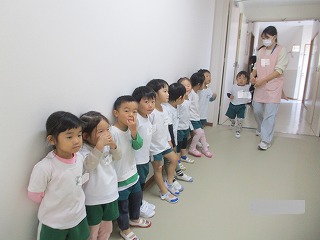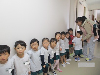 保育園は、毎月の身体測定と年2回の健康診断(内科、歯科)があり、子どもたちの体の成長、発達、早期の疾病などを把握するために行われます。お医者さんが来る!という話を聞き、順番を待つ表情はいつもとは違い、緊張の様子です。(だいじょうぶ、やさしいお医者さんだよ(*’▽’) )