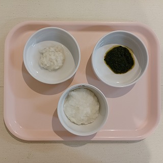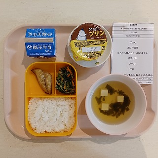 今日の給食は、ごはん、さばの塩焼き、ほうれん草ともやしのゴマダレの和え物、すまし汁、プリン、牛乳です。
