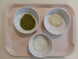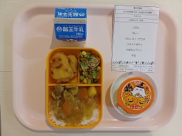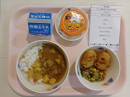 今日の給食は、ごはん・カレー・ブロッコリーサラダ・ポテト・かぼちゃババロア・牛乳です。