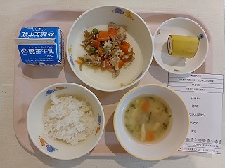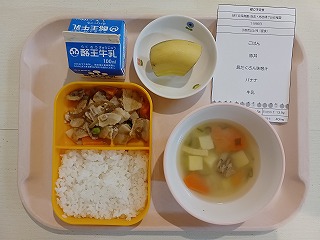 0~4歳のお友達は、あたたかくておいしい自園給食です。豚丼、具だくさんみそ汁、バナナ、牛乳です。