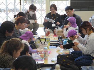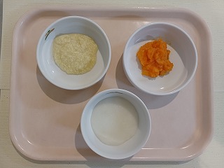 今日は、さくら組のお友達の昼食は、やわらかーいお餅とあたたかーい具だくさんの豚汁です。