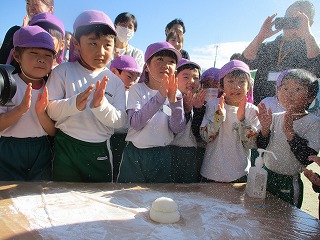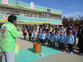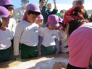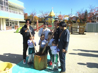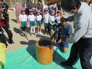 さて、さくら組は春に田植え、初夏・秋に稲の観察に出かけ、先月、稲刈りを行い、もちつきを迎えました。杵、うすを使ってのもちつきは、伝統行事ではあるものの、なかなか体験できない活動です。園児も保護者の方も、餅の出来上がりに興味深々です。