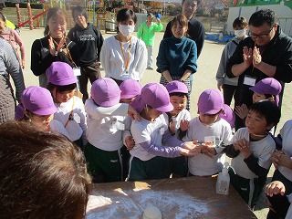 杵でついた餅を、親子でさらにやわらかく順番につきます。つきあがったお餅は、お正月に飾る鏡餅を担任の先生が器用にまるめました。出来上がり・・・みんなでお祈りです(*^-^*)