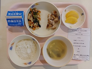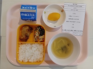 さて、給食の時間です。今日は、和風ローストチキン、高野豆腐のそぼろ煮、みそ汁、デザートは柿、牛乳です。