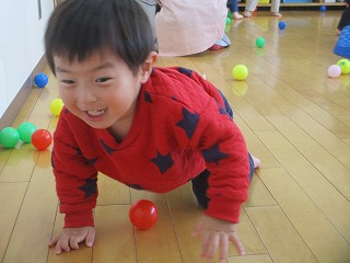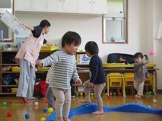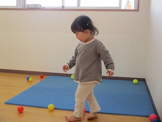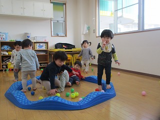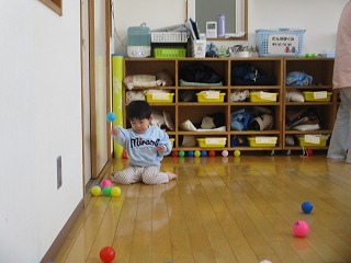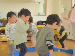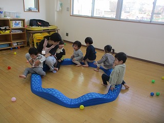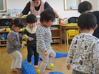 たんぽぽ組1グループのお友達が、お部屋でボール遊びをしていました。平均台で丸い囲いを作り、ボールのお風呂に見立てて遊べるよう設定をしました。