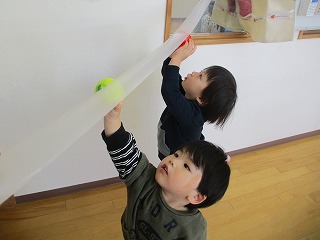 テープにボールを貼り付ける時にも、力加減が難しいようでした。「そーと、そーとだよ」と声をかけると、上手に貼り付けていましたよ。最後は、みんな一緒で、ドライブごっごをしました。