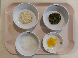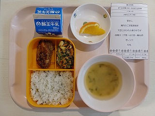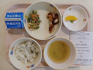 丈夫な体作りには食事が大事! 今日の給食は、菜飯、鶏肉の胡麻風味焼き、大豆とほうれん草のサラダ、みそ汁、オレンジ、牛乳です。栄養たっぷりですね