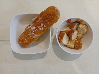 おやつは、揚げパンです。ごはんをしっかり、たっぷりの睡眠時間で、元気に過ごしましょうね