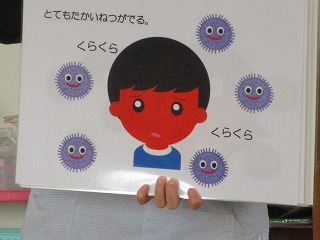 みんな真剣に聞いています。インフルエンザウイルスが、体の中に入ると発熱、鼻水、体の痛みがあることを教えてくれました。予防対策は、手洗い、うがい、栄養のある食事、じゅうぶんな睡眠です。