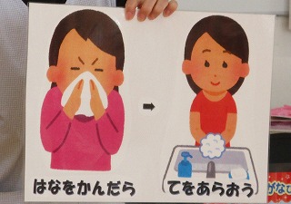 咳やくしゃみをすると、遠くまでウィルスが飛びます、そのためにマスク着用、咳エチケットのお話をしてくれました。ぜひ、みなさんもご家庭で振り返ってくださいね