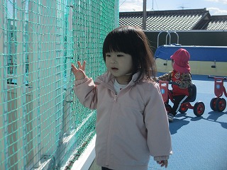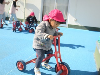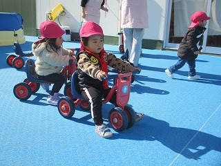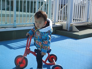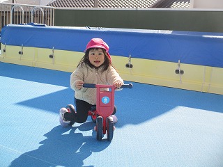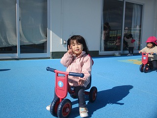 シャボン玉を追いかけごっこ楽しんでました。また、三輪車に乗ったりや園庭の様子を眺めたり自分の好きな場所で遊べていましたよ(*^-^*)