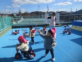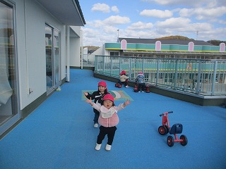 日差しはぽかぽかしますが、秋の風は、だんだんと冷たく感じるようになりましたね。たんぽぽ組のお友達は、園庭遊びのグループとテラス遊びのグループに分かれて、戸外遊びを楽しみました。今日は、テラスで遊んだおともだちの様子をお知らせしますね。