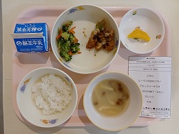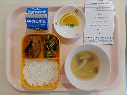 今日の給食は、ごはん・ピーマン肉詰めフライ・ブロッコリーサラダ・味噌汁(きざみ揚げ・なめこ)・オレンジ・牛乳です。