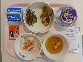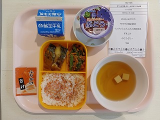 今日の給食は、ごはん、ふりかけ、鰆(サワラ)の西京焼き、インゲンと人参のゴマあえ、すまし汁、ぶどうゼリー、牛乳です。サワラの西京焼きは、新メニュー。甘い味噌で焼いています。