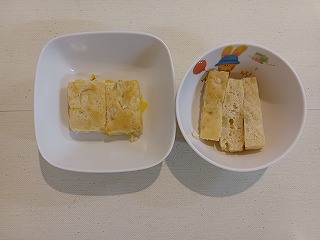 おやつも新メニュー、特製さつまいもケーキです。さつまいもは腸内環境を整えてくれますよ。