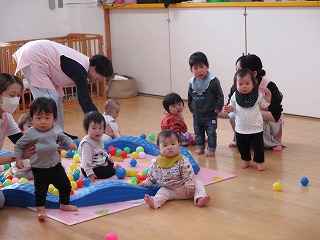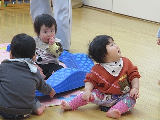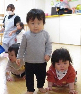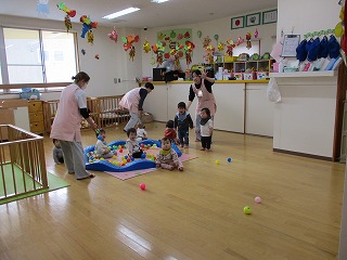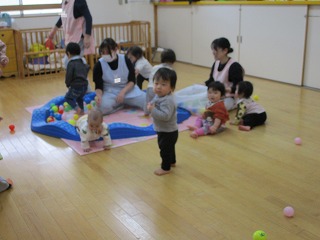 つぼみ組のお友達は、お客さまのほうによちよち歩き、ハイハイで近づいていきました😊お客さまに神対応のつぼみ組さんです。 お客さまにバイバイしたら、お給食の準備ですよ。