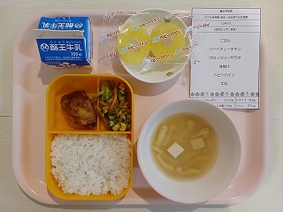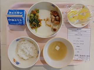 今日のお給食は、ごはん、バーベキューチキン、ブロッコリーサラダ、みそ汁(豆腐、油揚げ)、ベビーパイン、牛乳です。