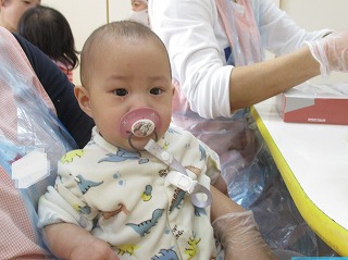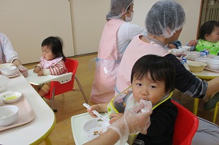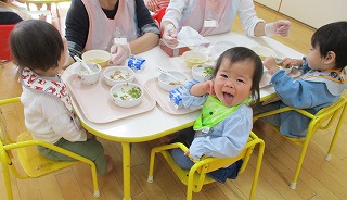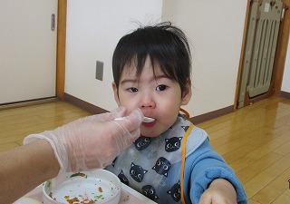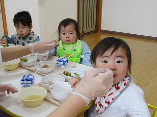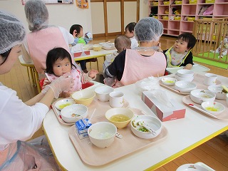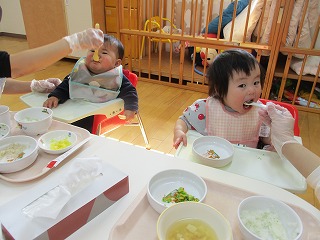 好きなお肉を自分でつまんで食べられたお友達、眠くなってしまったお友達と一人一人のペースにごはんを食べますよ。小さいおともだちは、ミルクを飲みましょうね。