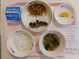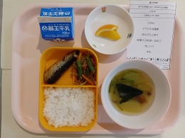 今日の給食は、ごはん、イワシの甘露煮、きんぴらごぼう、味噌汁(小松菜・なめこ)、オレンジ、牛乳です。おやつは、レクチェケーキです。