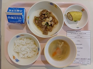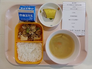 今日の給食は、すき焼き風丼、具だくさんみそ汁、バナナ、牛乳です。