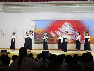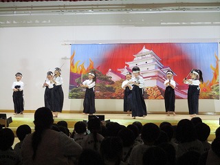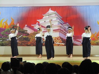 まずは、演舞『白虎隊』です。この演舞は伝統の演目になっています。いつもの楽しい雰囲気とは一転。勇ましい表情、立ち振る舞いに、小さい組のお友達は、釘付けです。