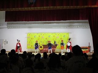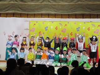 5歳児学年の発表会予行演習がありました。小さい組のお友達の前での発表は初めてですが、本番と同様に衣装を身に着け、元気に発表します。