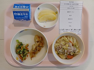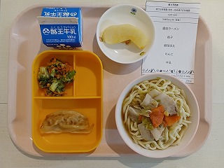 さて、今日の給食は、しょうゆラーメン、餃子、野菜添え、りんご、牛乳です。ラーメンはみんな大好きですよね。