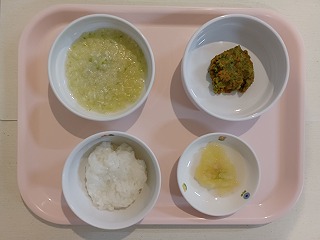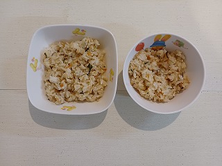 おやつは五目チャーハンです。いっぱい食べて、病気に負けないようにしましょうね。