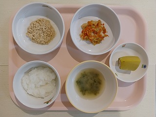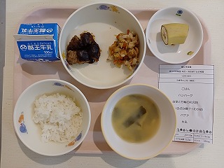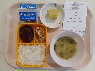 さて、今日の給食は、ごはん、ハンバーグ、白菜とちくわの和え物、みそ汁、バナナ、牛乳です。和え物は新メニューです。旬の白菜をかつお節、しょうゆ等で和えて、副菜に仕上げました。